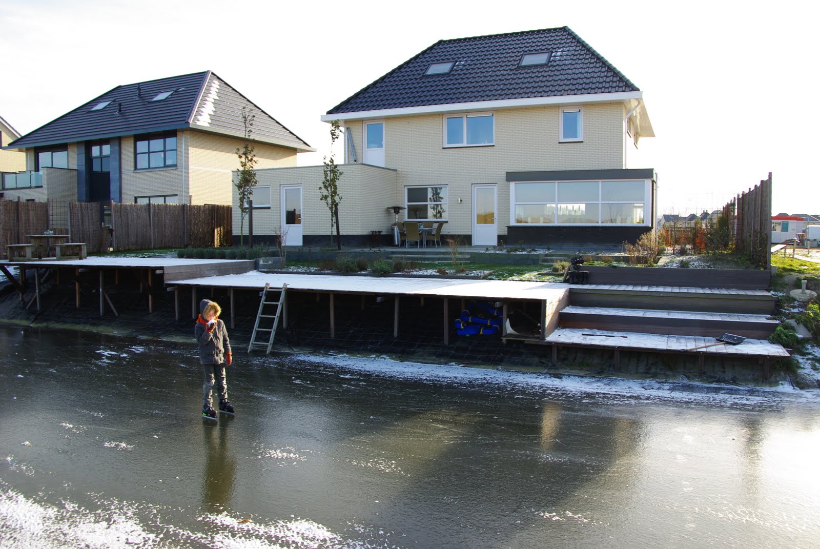 Vandaag was het weer zover: ijspret. Via onze vlonder was het een stuk makkelijker om het ijs op te komen. Begin 2010 moesten we nog heel voorzichtig het talud af rennen of glijden. Het was wel heel koud, maar de kinderen zijn wel 2 uur zoet geweest op het ijs: schaatsen en sneeuw verzamelen.